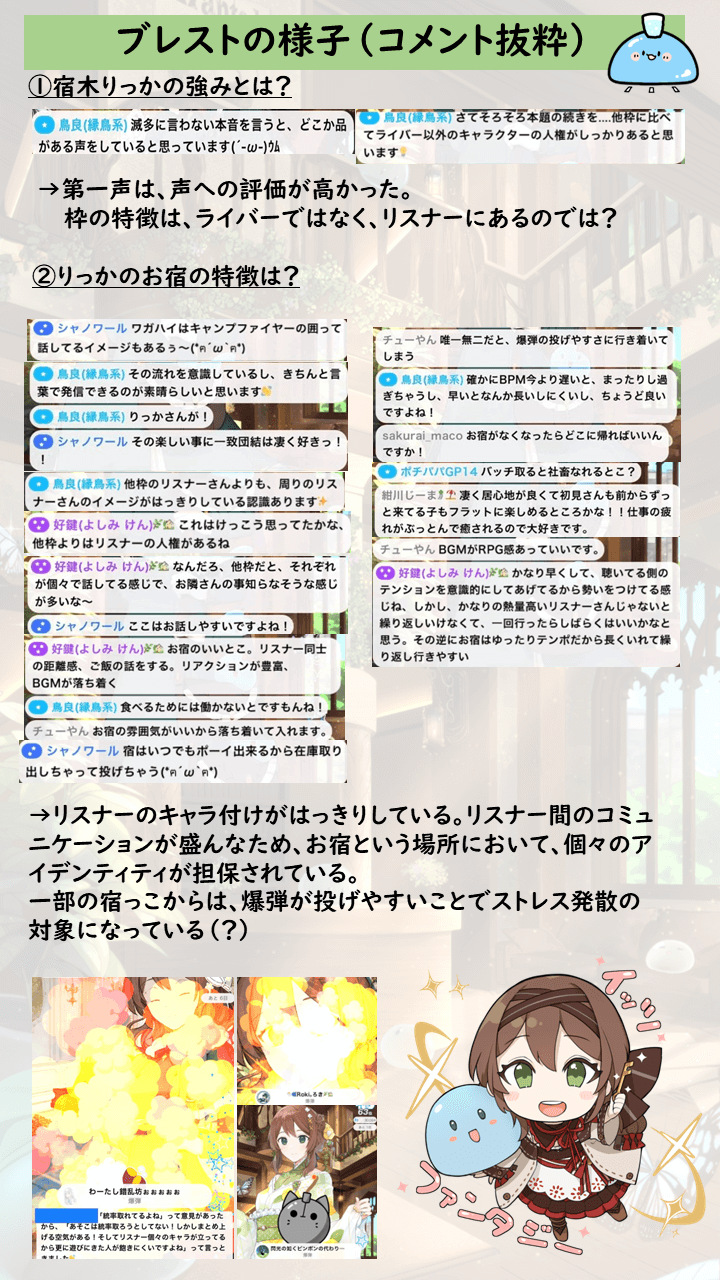 それを日々続けていると、自然とリスナーさん同士の壁がなくなってきて、それぞれの性格や人となりもわかってくる。お宿のなかで個々のアイデンティティが確立して、皆が自発的に活動しやすくなるし、リスナー間でのコミュニケーションも活発になるから、もはやお宿の外でも勝手に盛り上がっていたり、私の知らないところで何らかの企画が進んでいたりもするんですけどね(笑)。