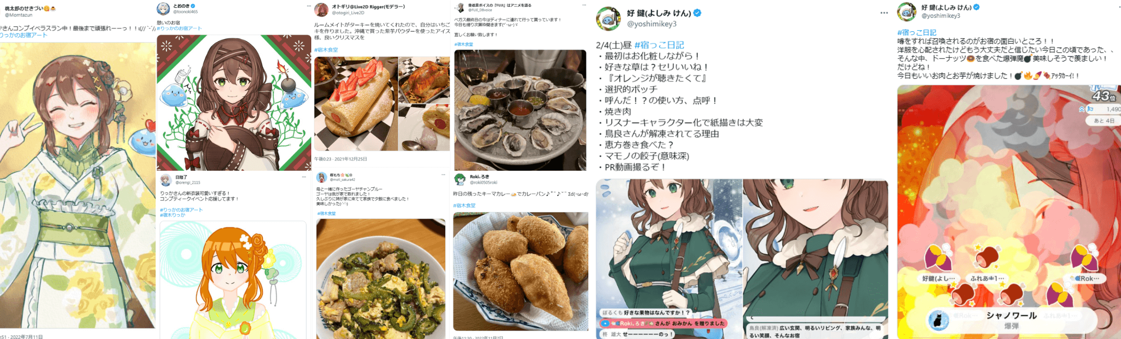 Twitterで言うと、日々の配信記録をまとめた「#宿っこ日記」、おいしいごはんタグ「#宿木食堂」に筋トレ履歴の「#宿木ビルドアップ部」などがありますが、元はすべてリスナーさん発信なんです。特に「#宿木食堂」は、宿っこ経由で美味しそうな画像がどんどんアップされるので、いまや私のタグだとはご存じない方々にも楽しんで閲覧いただけているようで。そんな広がりもまた嬉しいですし、もちろんお宿を知ってもらう機会につながることもあります。そんな風に、配信をきっかけにこちらが想像していないモノやコトが次々と生まれてくるんですよね。リスナーさんっていろんな意味でライバーを助けてくれる存在だなって思います。