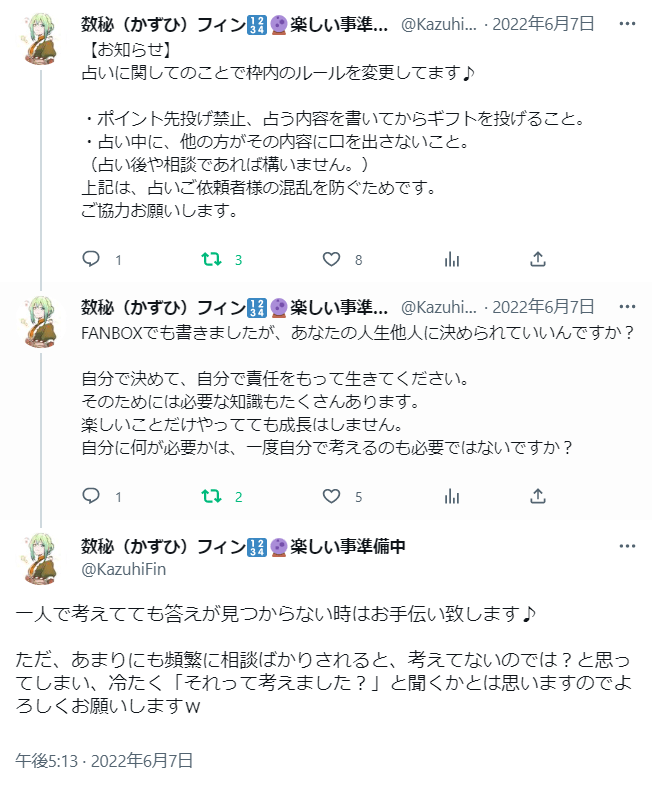 だからリスナーさんが「数秘フィンが最推し」って言っていたのに、ある日ファンマークが消えていたり急に枠からいなくなったりしたら悔しいし、心変わりした先のライバーさんに絶対嫉妬してしまうから。だったら最初から最推しって言われない方が気持ちも楽だし、心も乱さずに済むという、心に波風を立たせない防波堤としての「最推し禁止」なんです。
