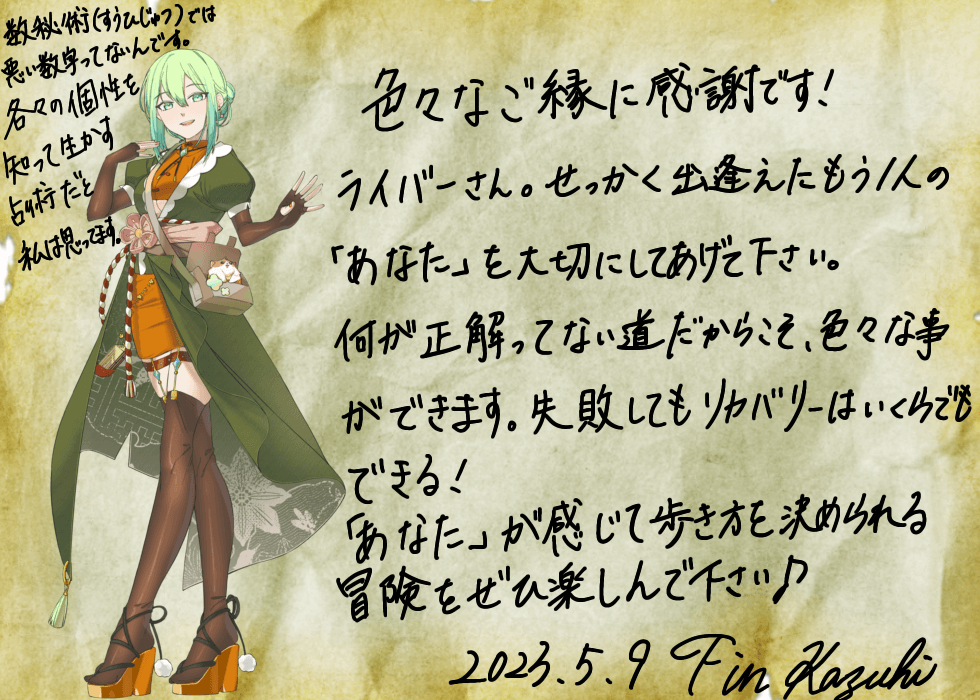 Twitterで誰かが呼びかけているのを見かけたとかがあれば別だったんですけど、完全に水面下で、私にまったく知られることなく。しかも色紙3枚分・合計52人もの方がひとつひとつ丁寧につづってくれたのが伝わってくる、想いのこもったメッセージばかりで、ただただ感動でした。自分が、数秘フィンがこんなに愛されていたんだ、こんなに応援してもらえるライバーになれたんだって、1位以上の結果をもらえた気がして感謝でいっぱいになりました。