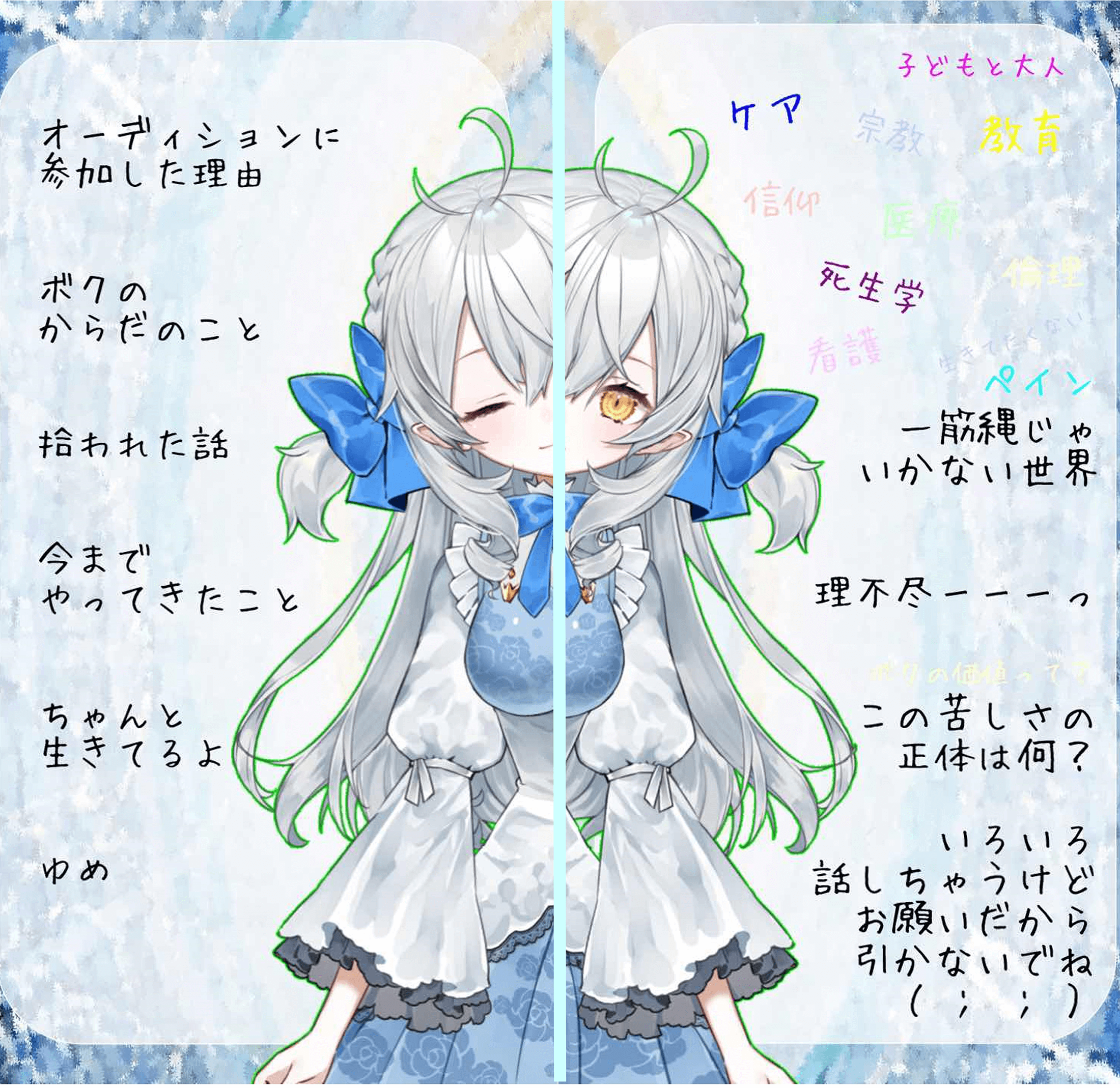 そんなとき、頭によぎったのがVtuberとしての活動で。体が弱くても周りに迷惑をかけず、自宅でできる配信コンテンツならばと、まずはとあるVtuberオーディションで勝ち進んでLive2Dになることを目標に挑戦しました。それがこの世界に飛び込んだきっかけです。