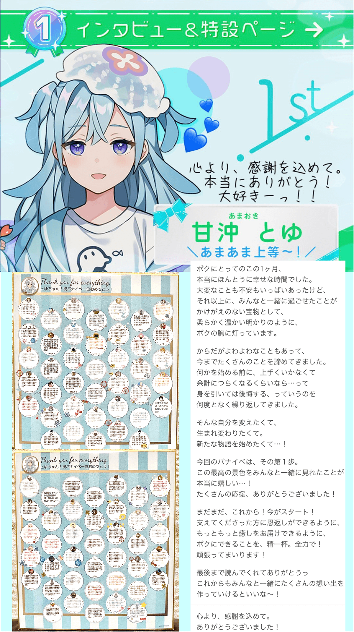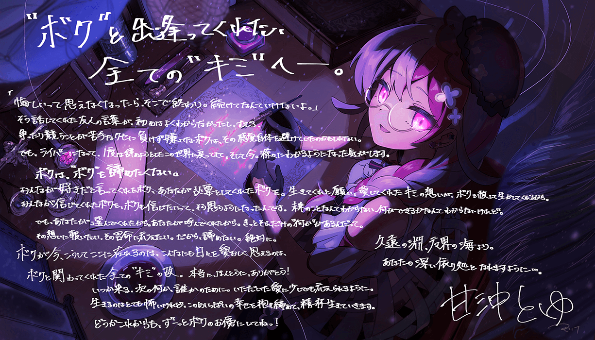 ボク自身、いまだに日々手探りで、めざす方向も常に変化している。ただ「誰かの幸せを願う配信を続ける」という根幹部分はぶれずに貫きたい。みんなと過ごせる時間、その何気ない日常にある幸せの積み重ねがあって、いまのボクがあることを決して忘れないし「甘沖とゆ」で在り続けることを絶対に諦めない。みんなへの感謝を忘れず、少しでも恩返しができるよう、そして応援したことを誇ってもらえるように活動し続けたいと思います。