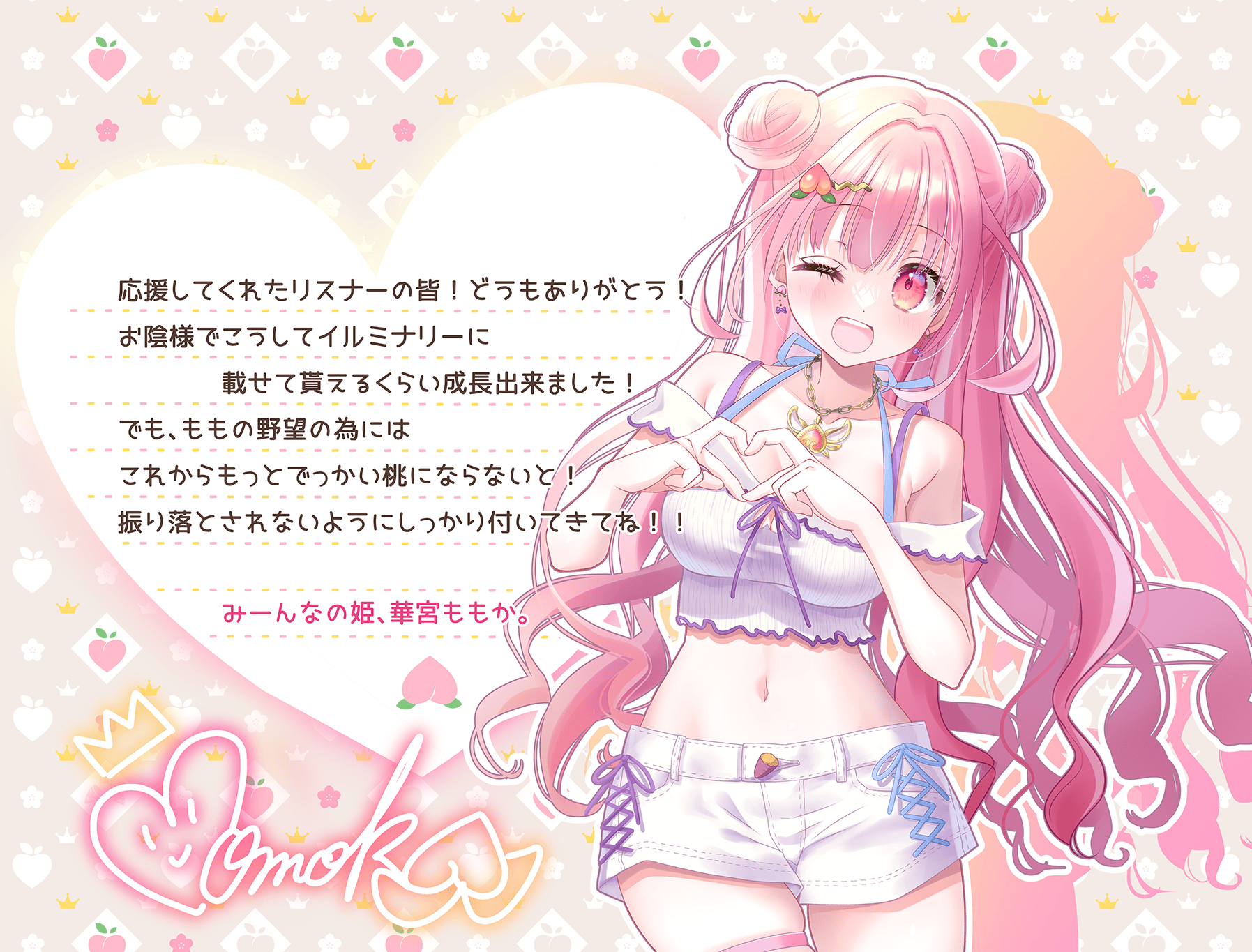 だからというわけではないですが、いま桃の国には一般的にいわれる「返礼品」は存在しないんです。当初はお礼にオリジナルグッズをつくって渡してたんですけど、なかなか大変な作業なんですよね。内容やデザインを考えて、データ入稿して、発送して。その時間でもっと配信できるのになって。ライバーの負荷はともかく、本当にリスナーのためになってるのかなって。私はできれば民とは「これをやるからギフトをください」「それが欲しいからギフトをあげる」という、こっちがやってんだからそっちもやってくれ、ではないところでつながりたい。それで民に意見を求めたんです。