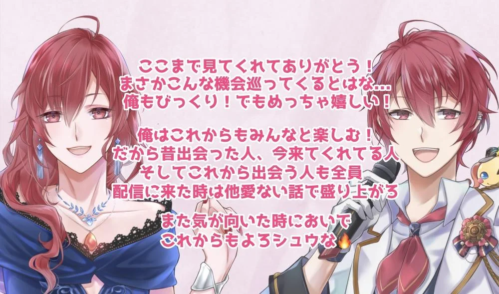 いまは男性ライバーも多くなってきたし、コミュニティランクやイベント経歴からも「IRIAMの男性ライバーといえばシュウ!」とならないのはわかってるんですけど、配信環境も精神的にも日々ベストってくらい安定してるし、いまのバランスをうまく維持しながらじわじわ上をめざして、たくさんの方に認めてもらいたい!