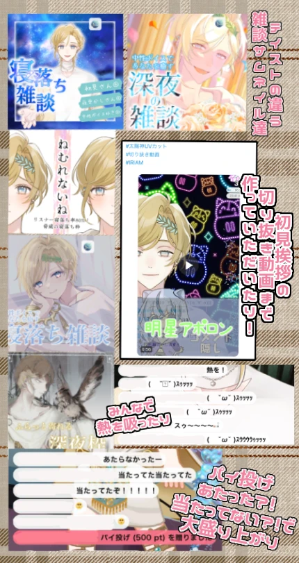 ささいなことのようだけど、サムネイルってIRIAMを開いて真っ先に目につくものだし、そこで自分の枠を見つけてもらえるかどうか、リスナーさんに来てもらえるかどうかが決まるので、思った以上に大事なんですよね。初配信では誤字にも気づかなかった僕ですが(笑)、自分の枠に合ったコピーを選ぶだけでもリスナーさんの反応は変わってくると思うし、実際に変わりました。