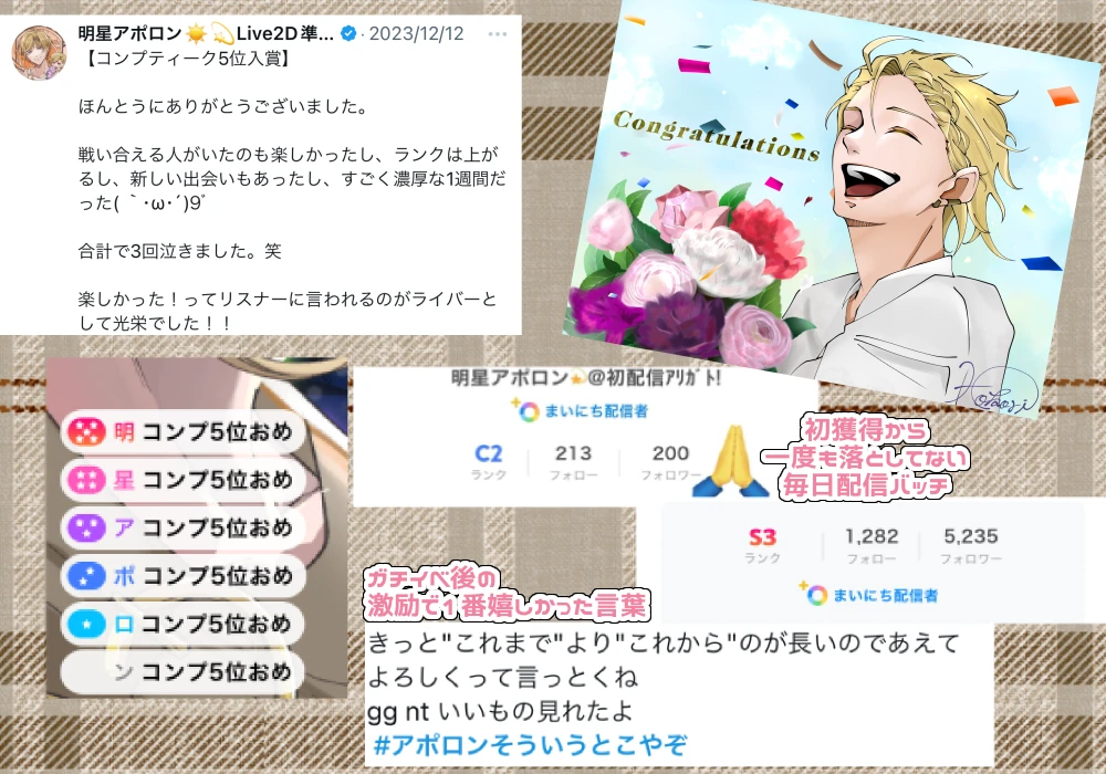 しかも事務所初のSランク帯ライバーになれた達成感とか、根深いコンプレックスから解き放たれてホッとする気持ち、すべてを理解したうえで寄り添い、全力で押し上げてくれたみんなへの感謝なんかが一気に押し寄せてきて、涙が止まらなかったですね。いやぁ泣きました(笑)。